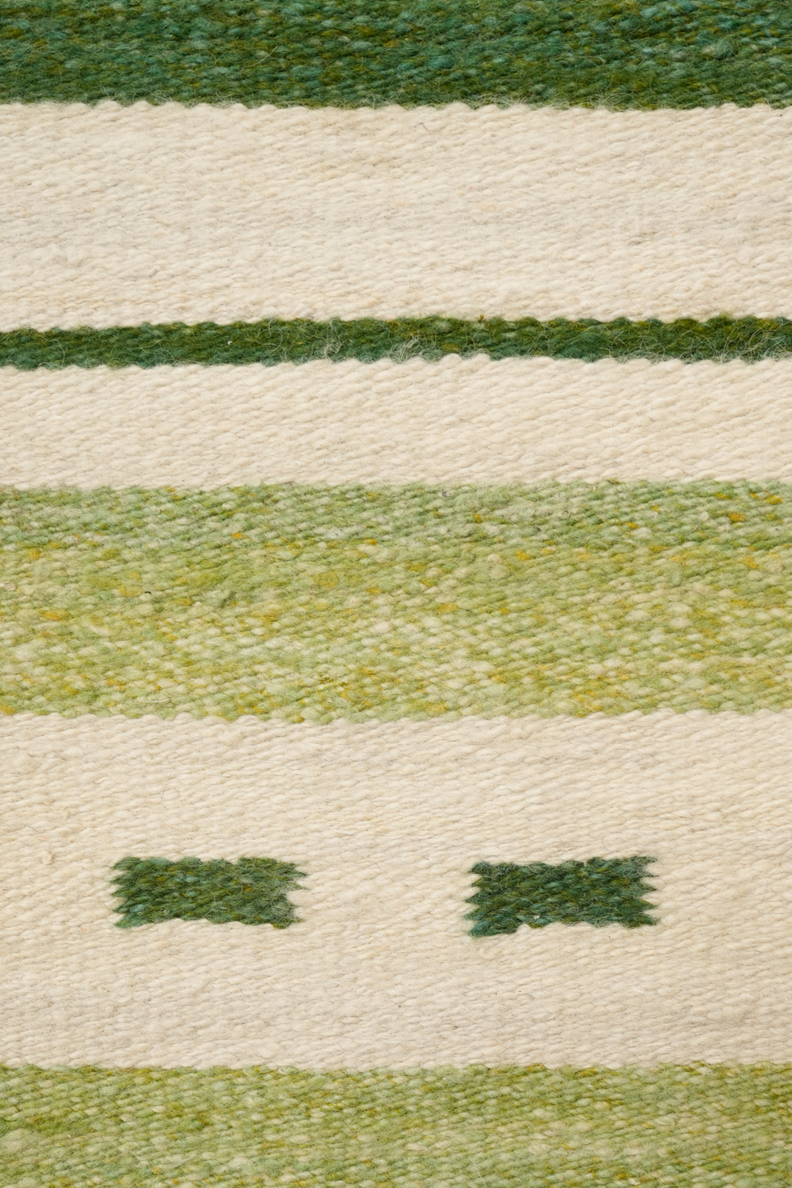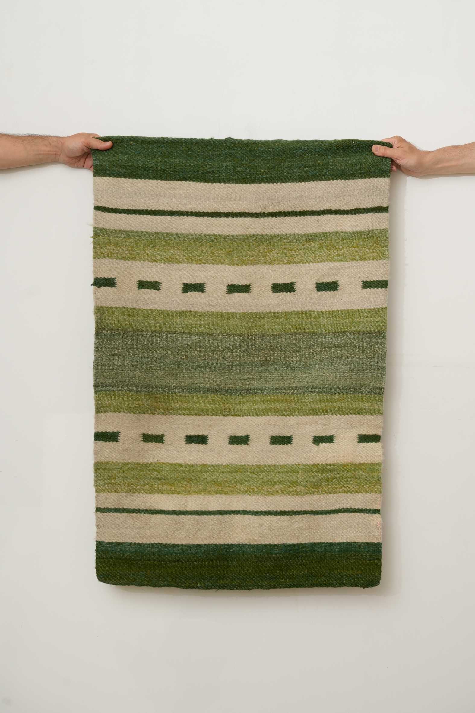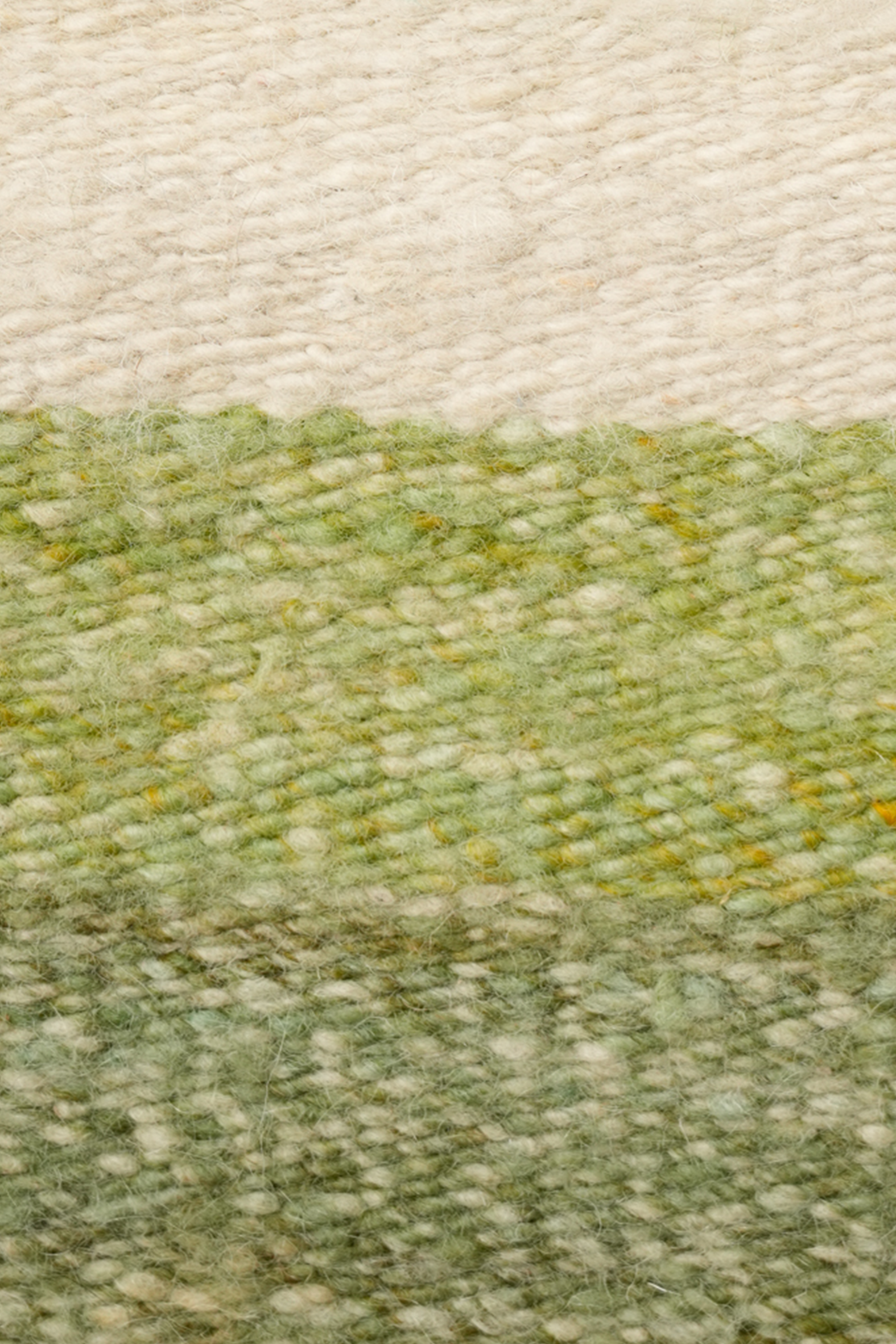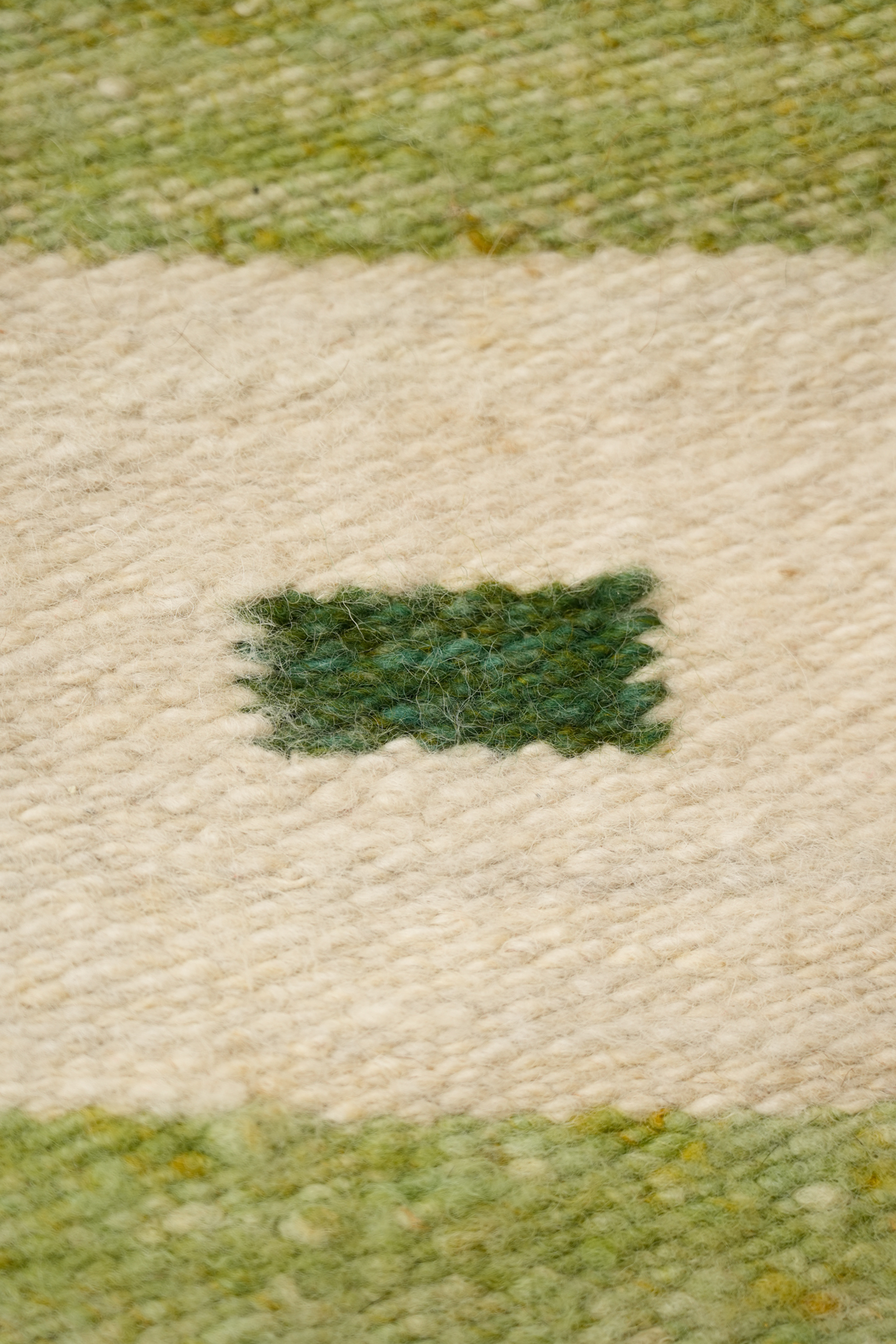 La alfombra Mampa evoca paisajes frescos con su paleta de verdes y tonos naturales. Tejida artesanalmente en telar con lana de oveja, resistente al alto tránsito, combina diseño y funcionalidad, ideal para espacios que buscan calma y conexión con la naturaleza.