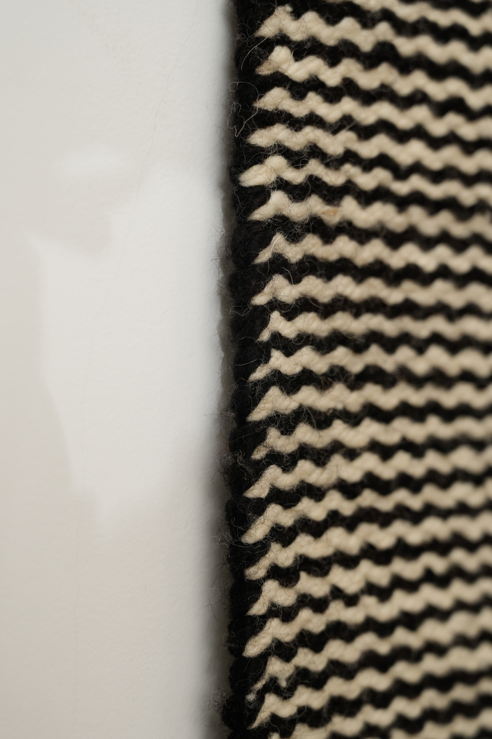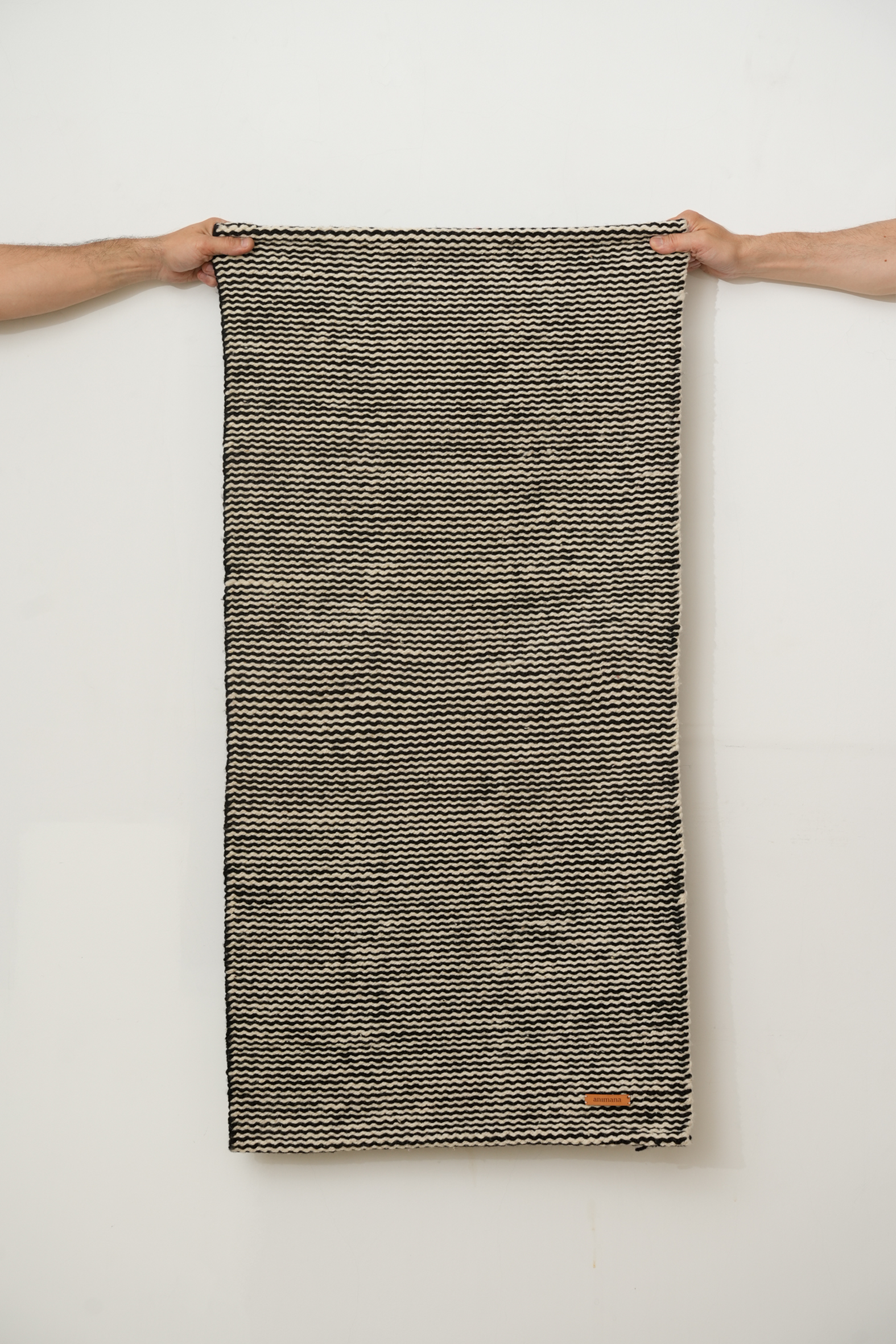 Blanco y negro se funden en un diseño que evoca los paisajes secos del Chañar. Esta alfombra tejida artesanalmente con lana de oveja, y alto tránsito, combina fuerza visual y nobleza en sus materiales, ideal para destacar cualquier espacio.