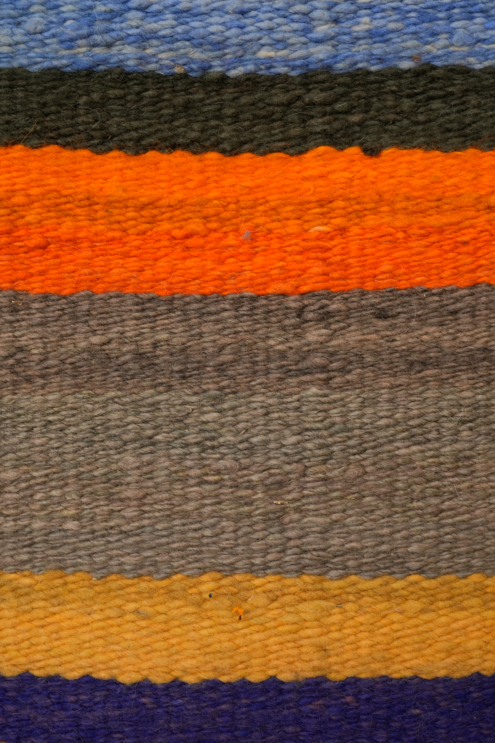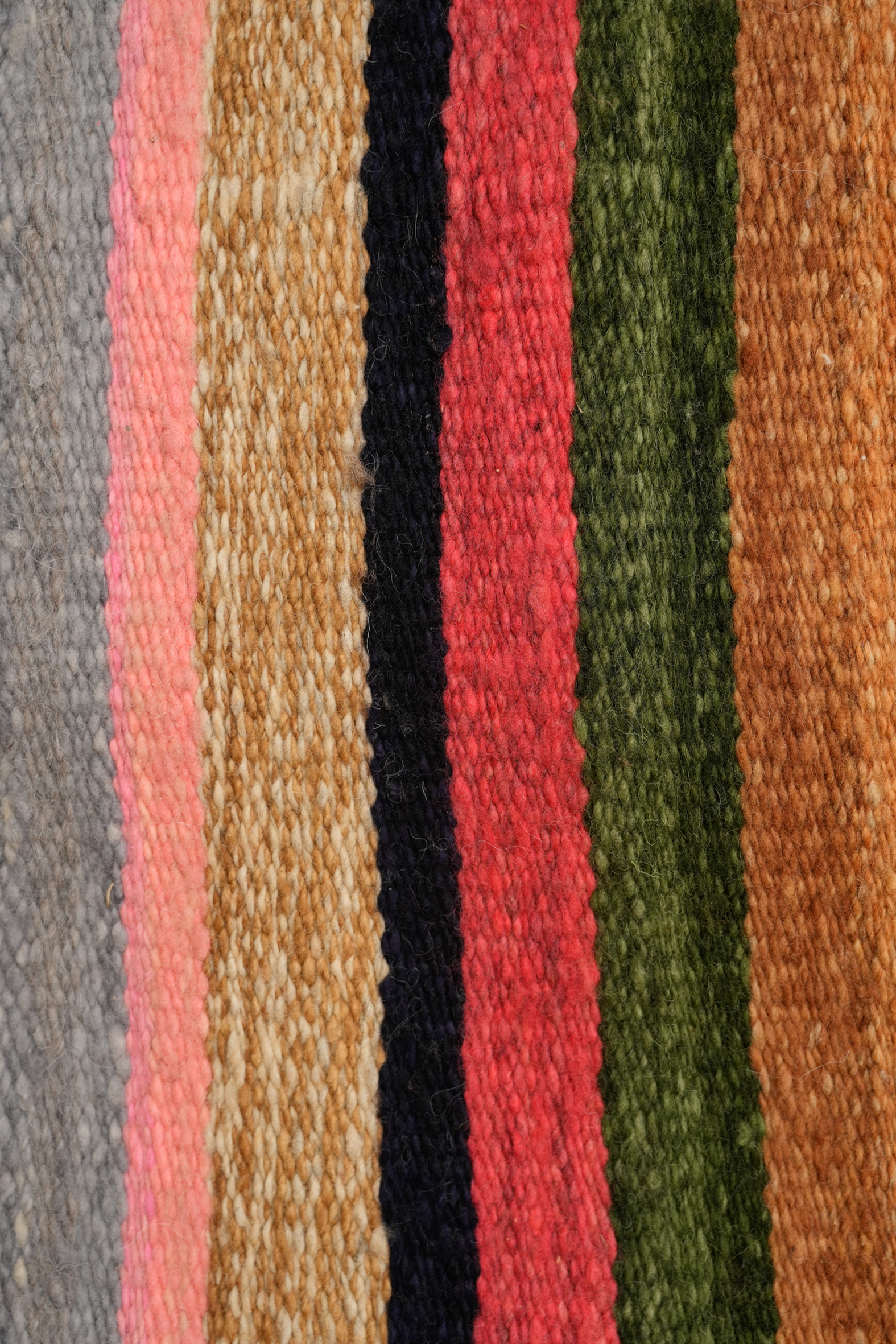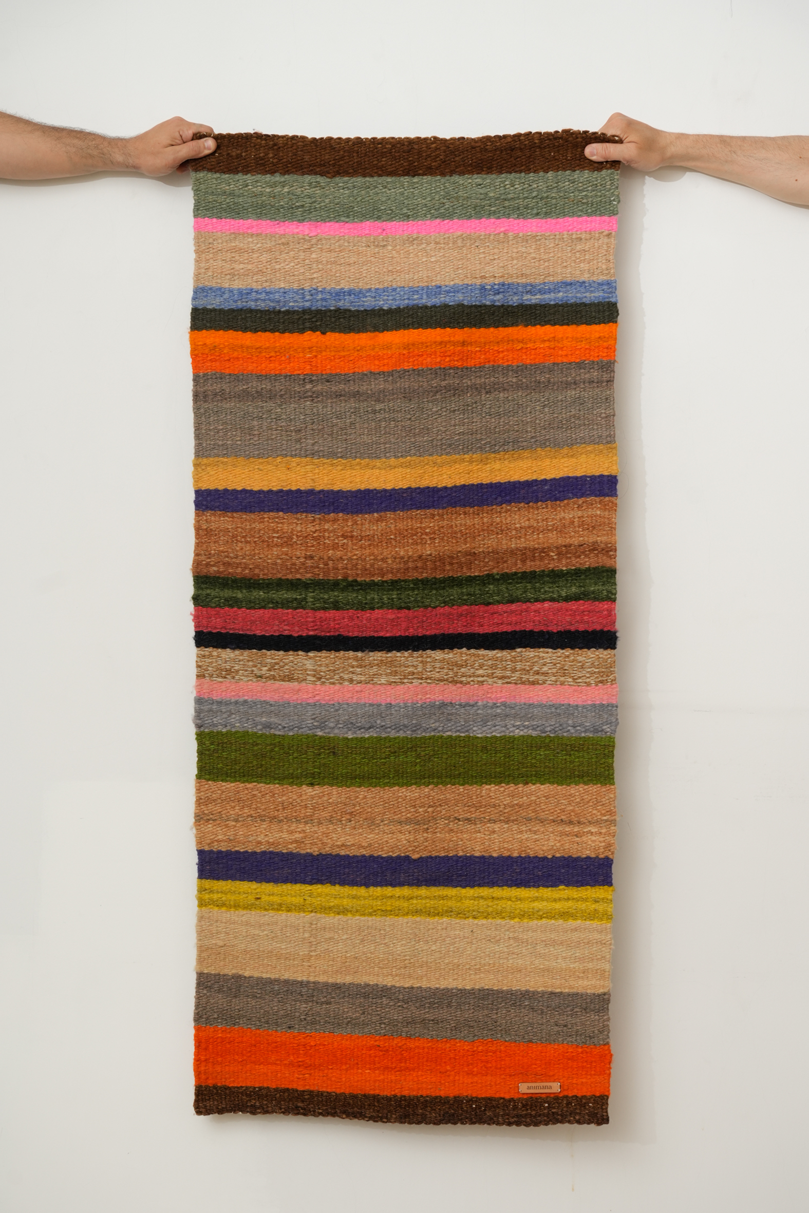 Una explosión de color en forma de rayas. Esta alfombra tejida a mano en telar con lana de oveja, de alto tránsito, combina múltiples tonos para dar vida y dinamismo a tus espacios. Cada pieza es única, como el trabajo artesanal que la crea.