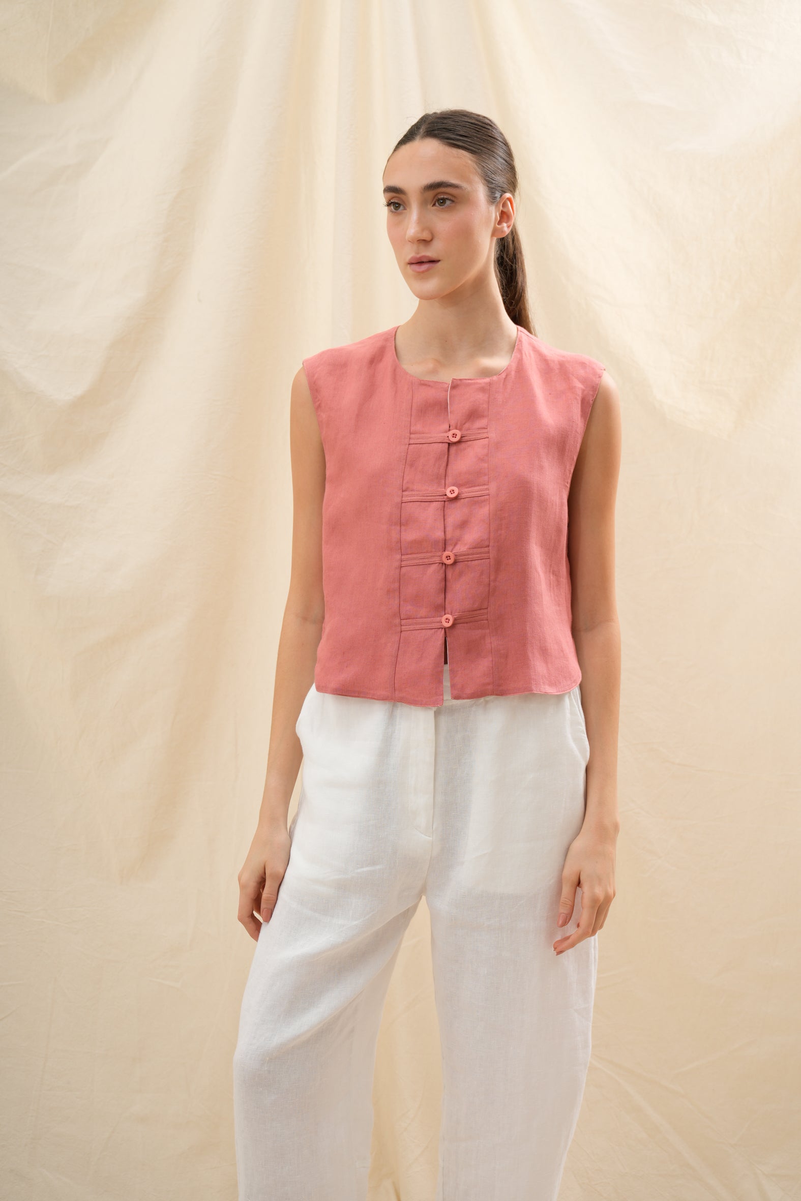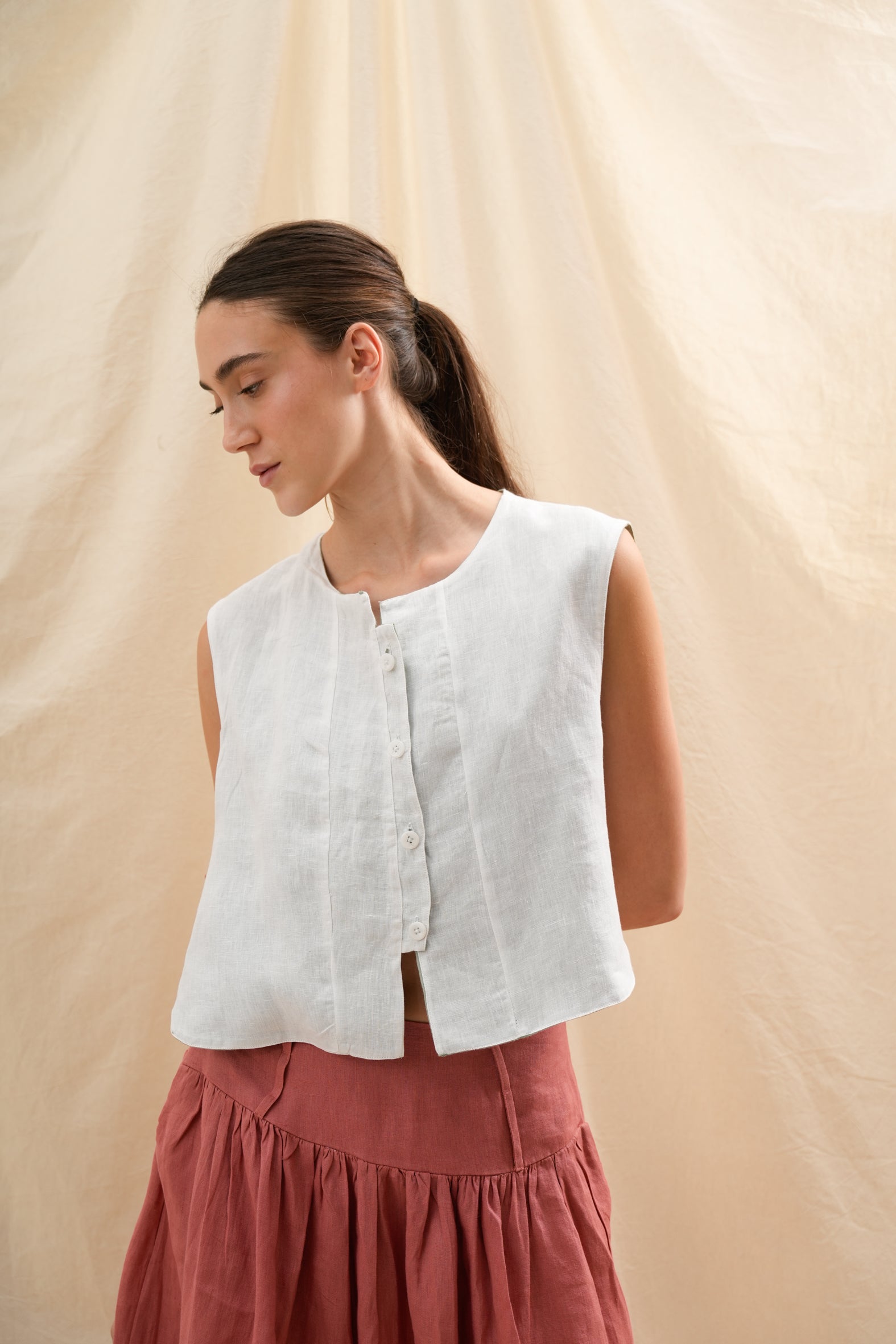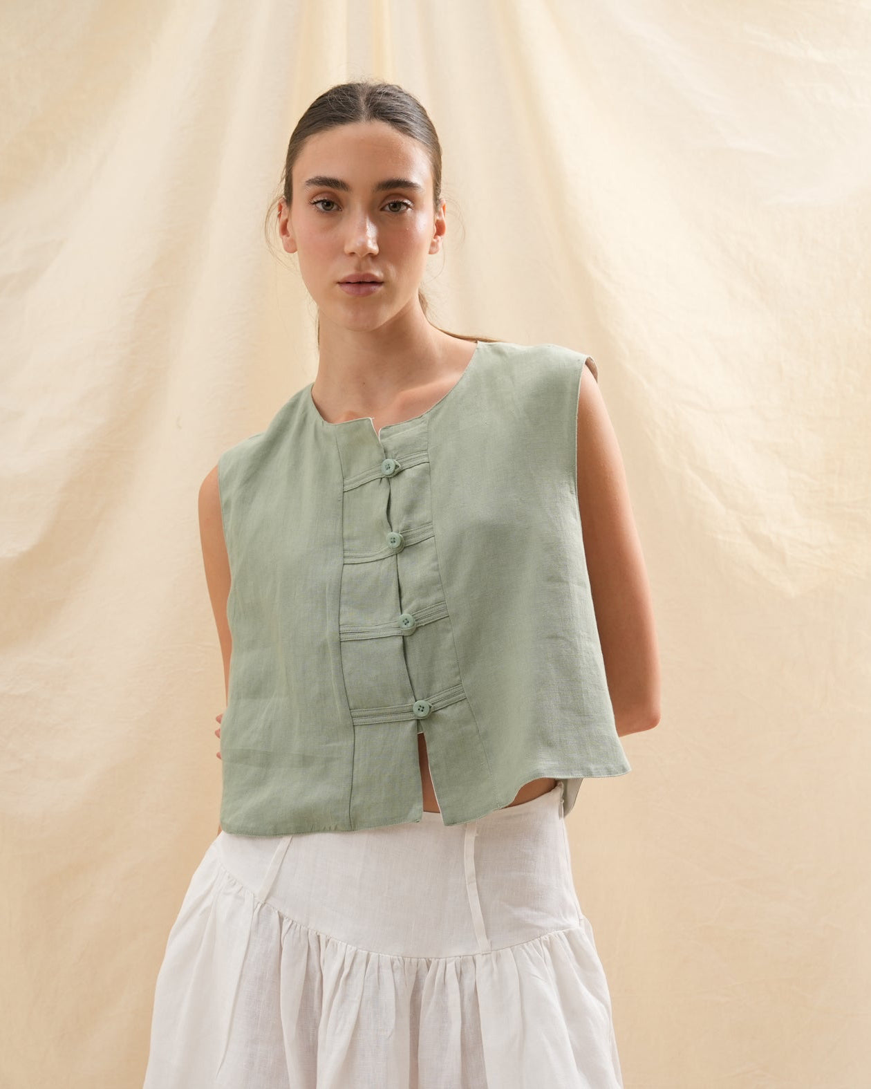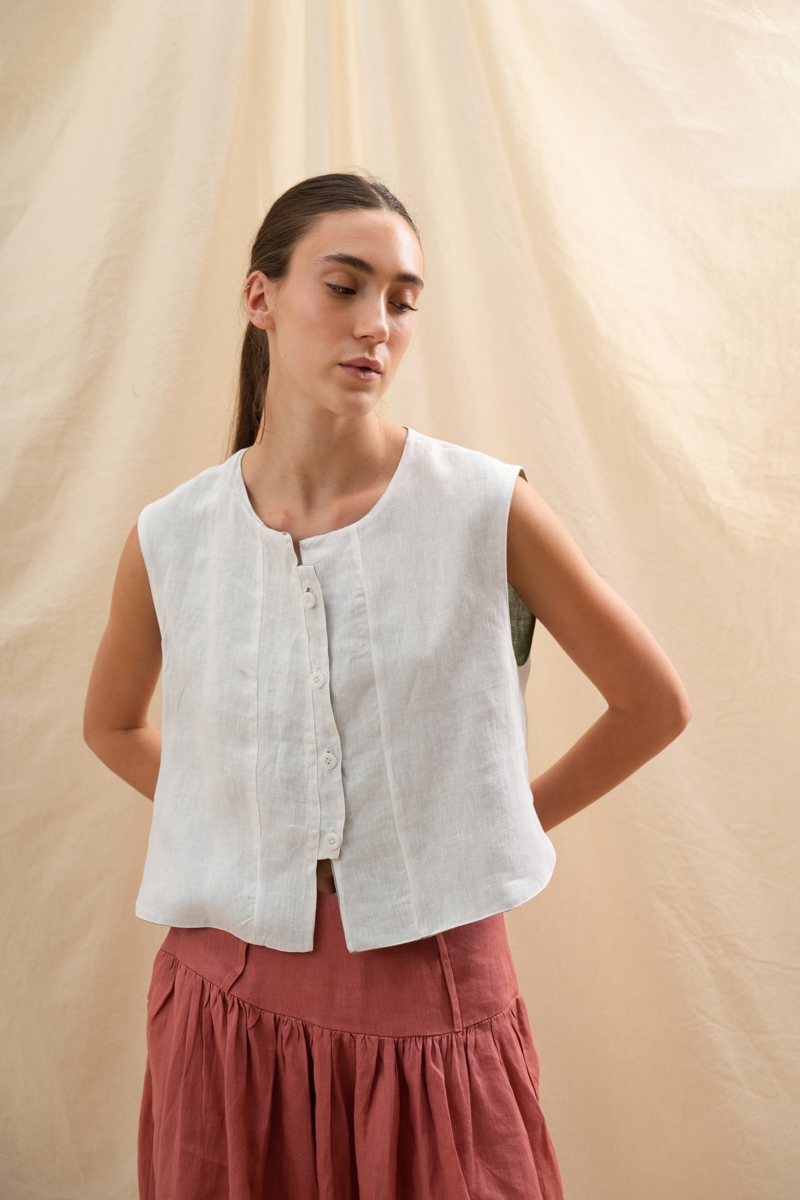 Confeccionado en lino europeo de alta calidad, redefine las superposiciones con una silueta liviana pero estructurada que aporta elegancia discreta a cualquier conjunto.