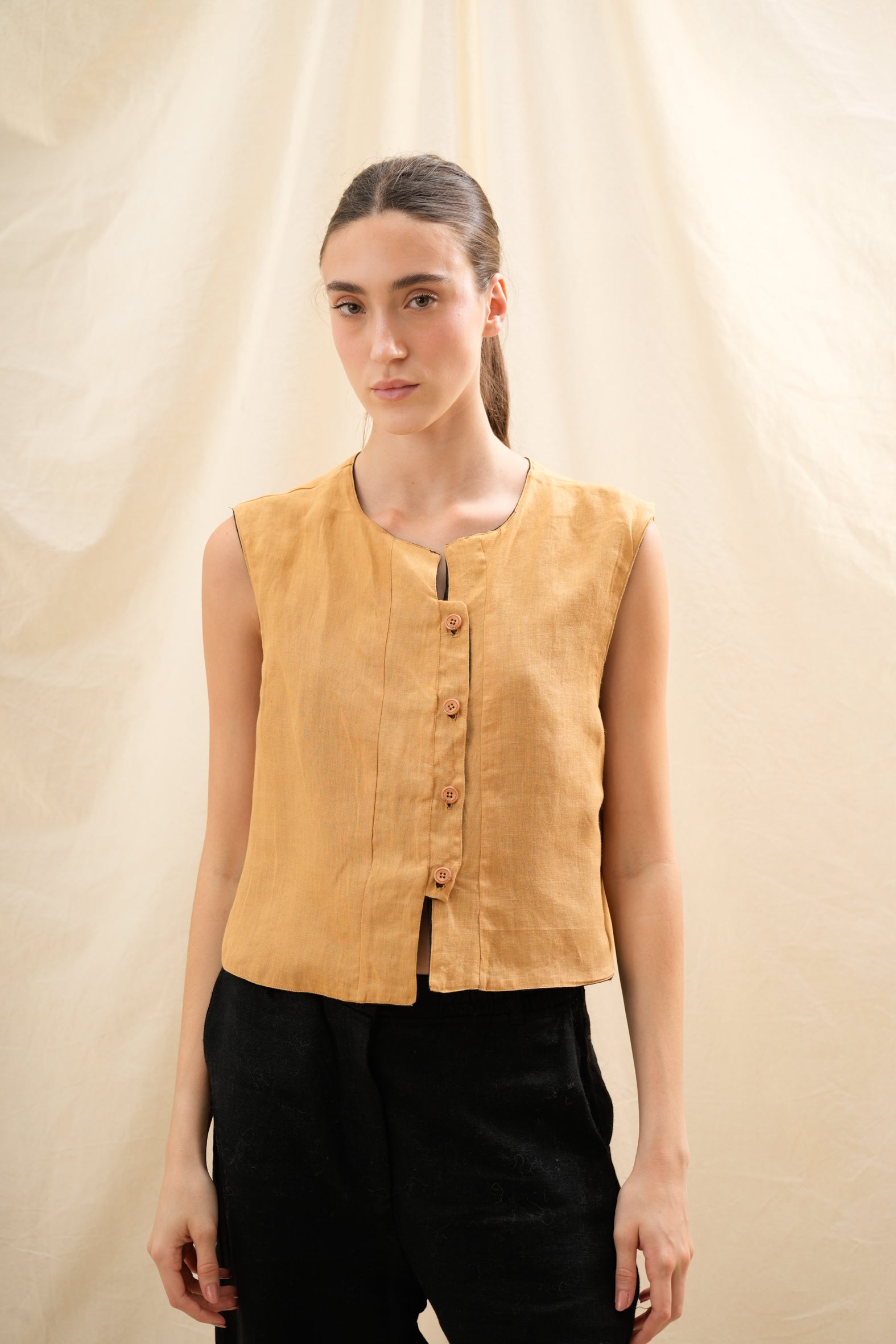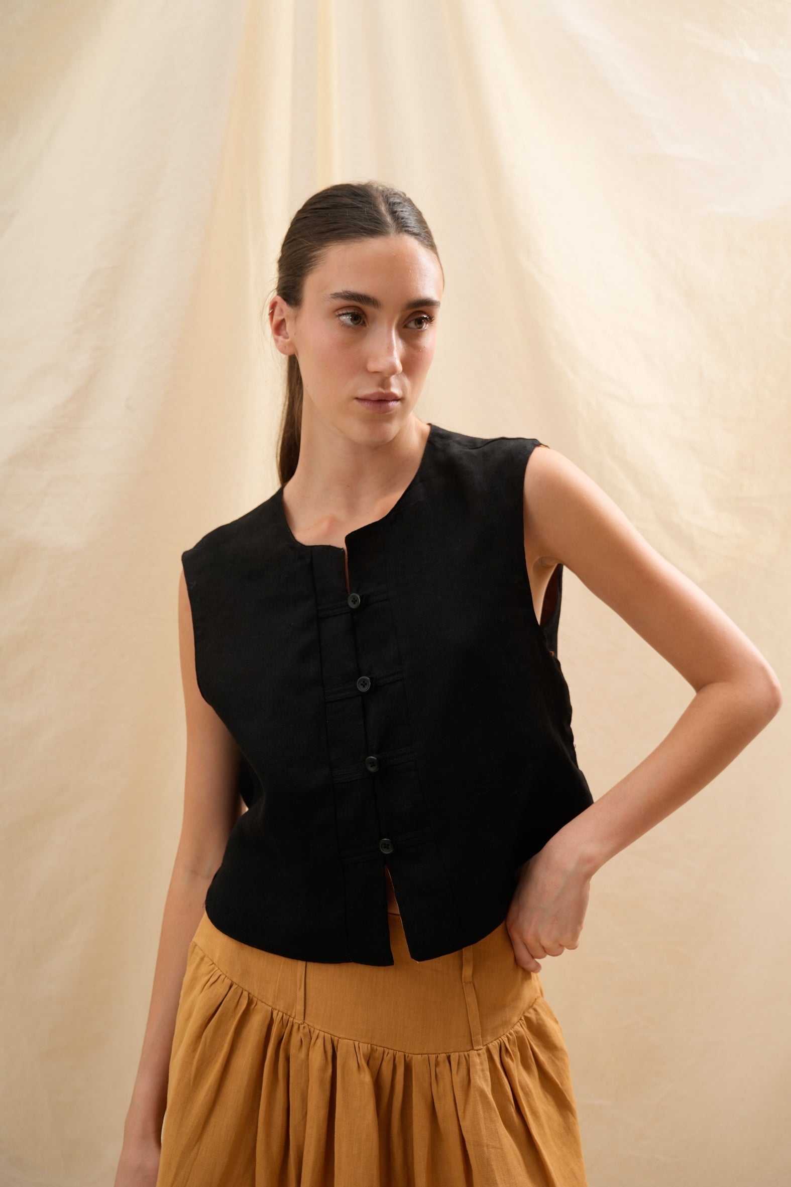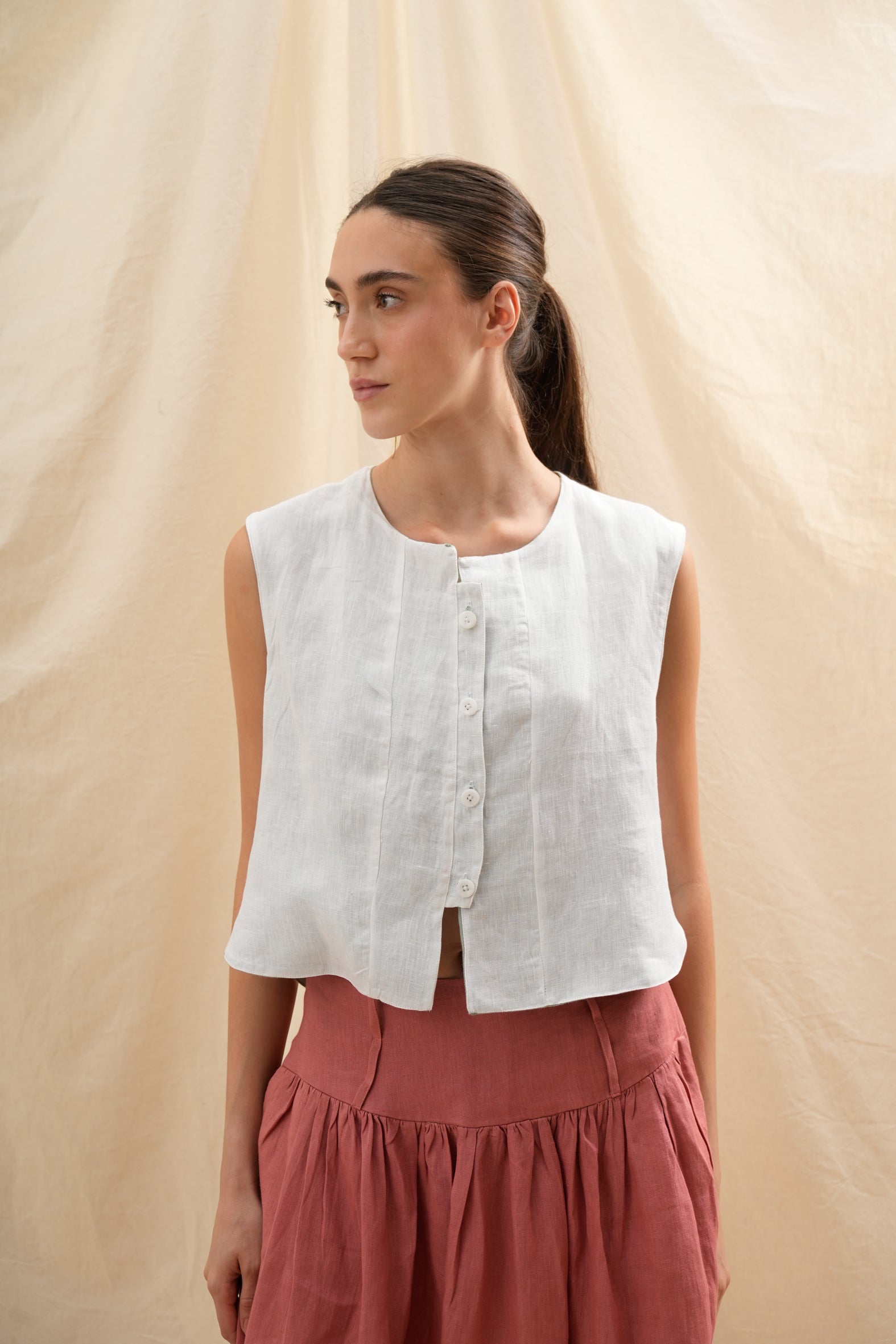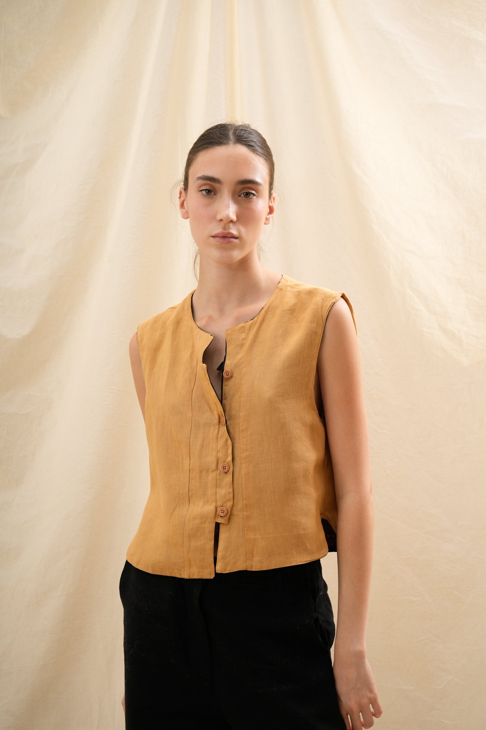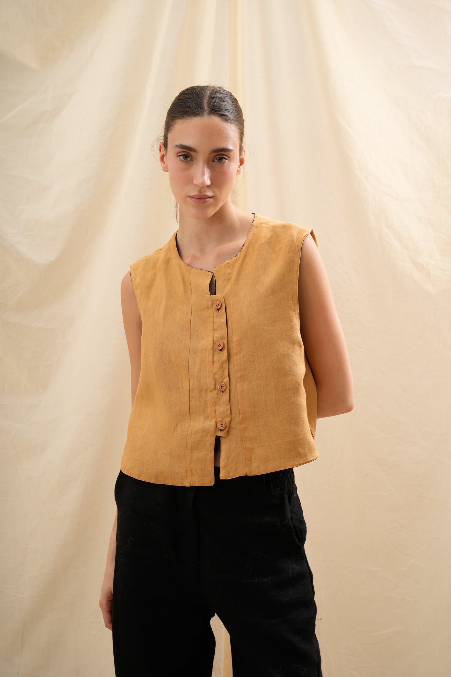 Confeccionado en lino europeo de alta calidad, redefine las superposiciones con una silueta liviana pero estructurada que aporta elegancia discreta a cualquier conjunto.