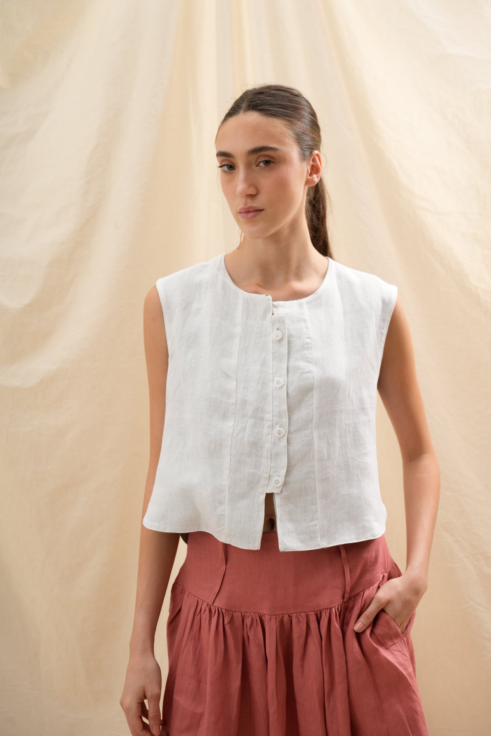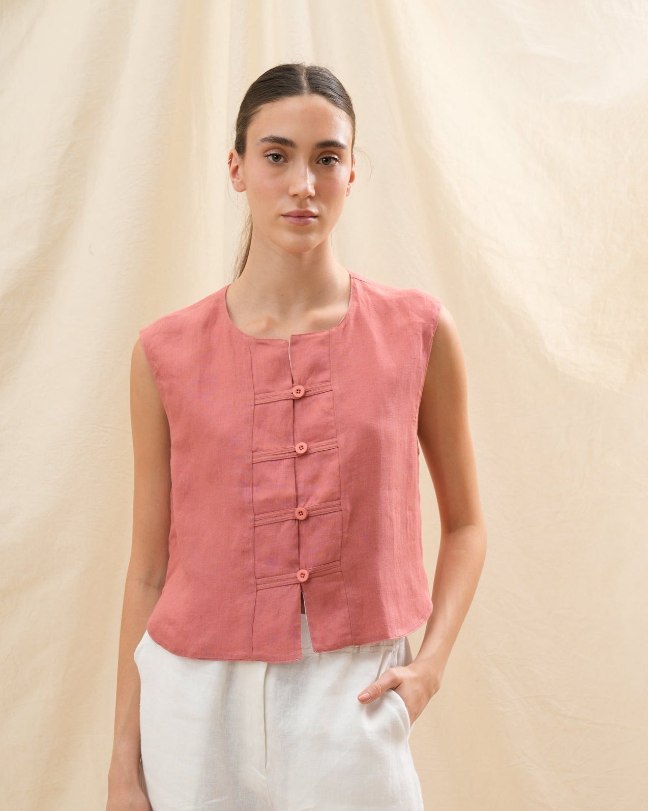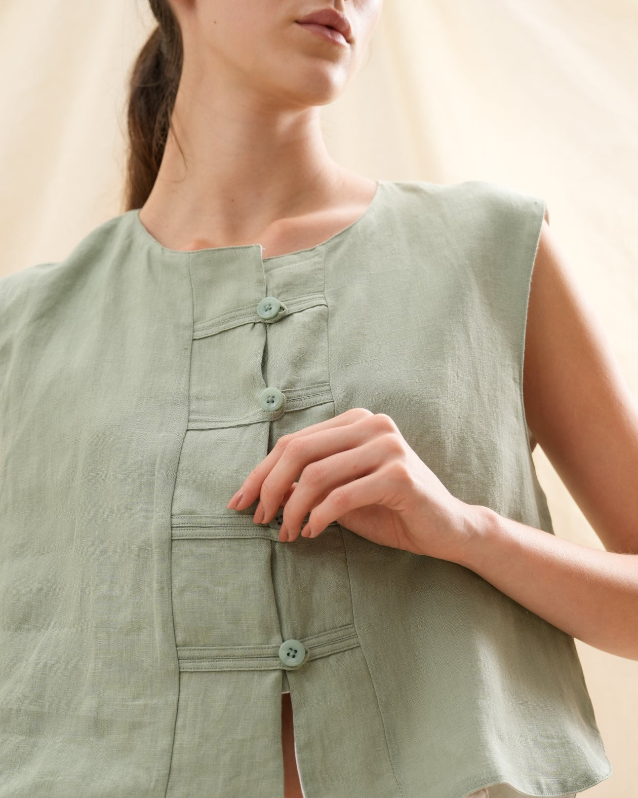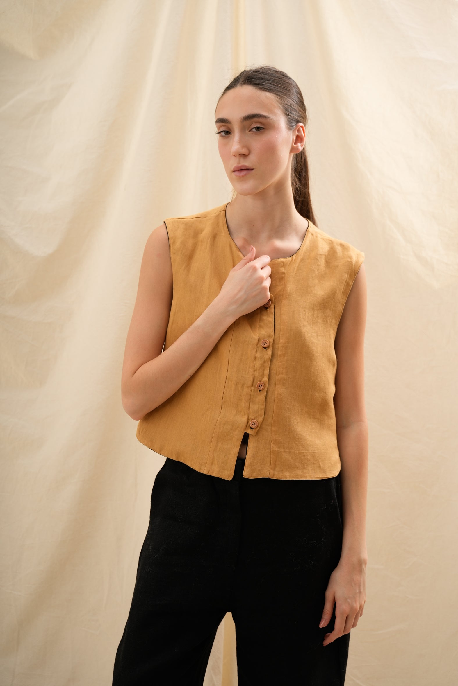 Confeccionado en lino europeo de alta calidad, redefine las superposiciones con una silueta liviana pero estructurada que aporta elegancia discreta a cualquier conjunto.