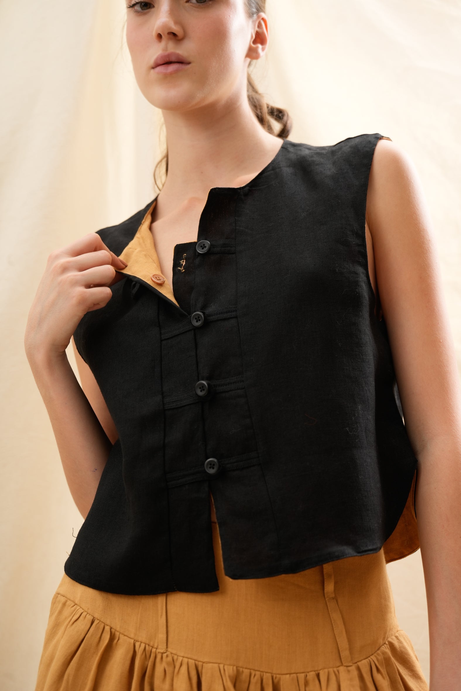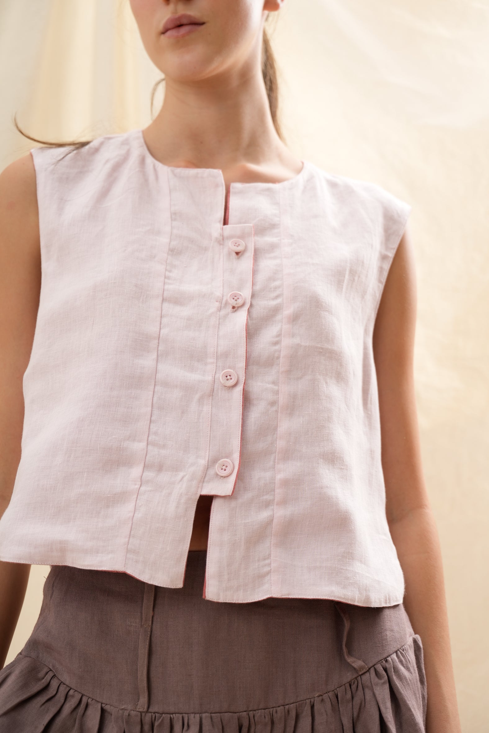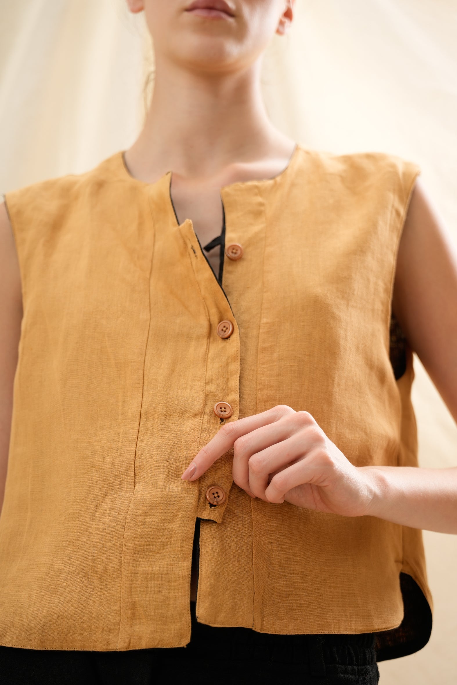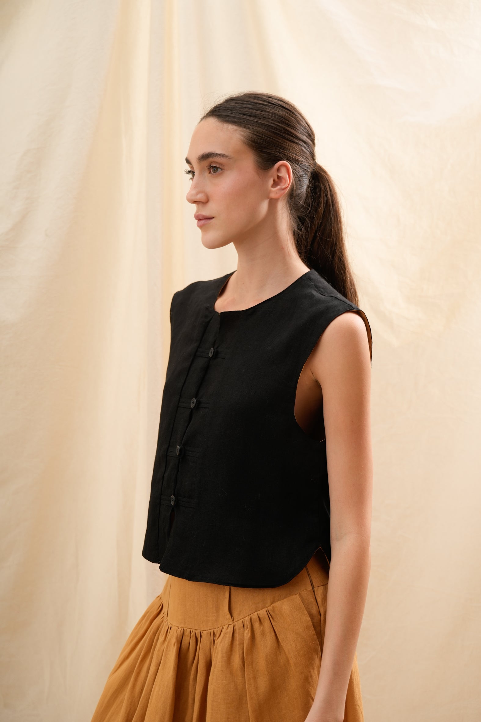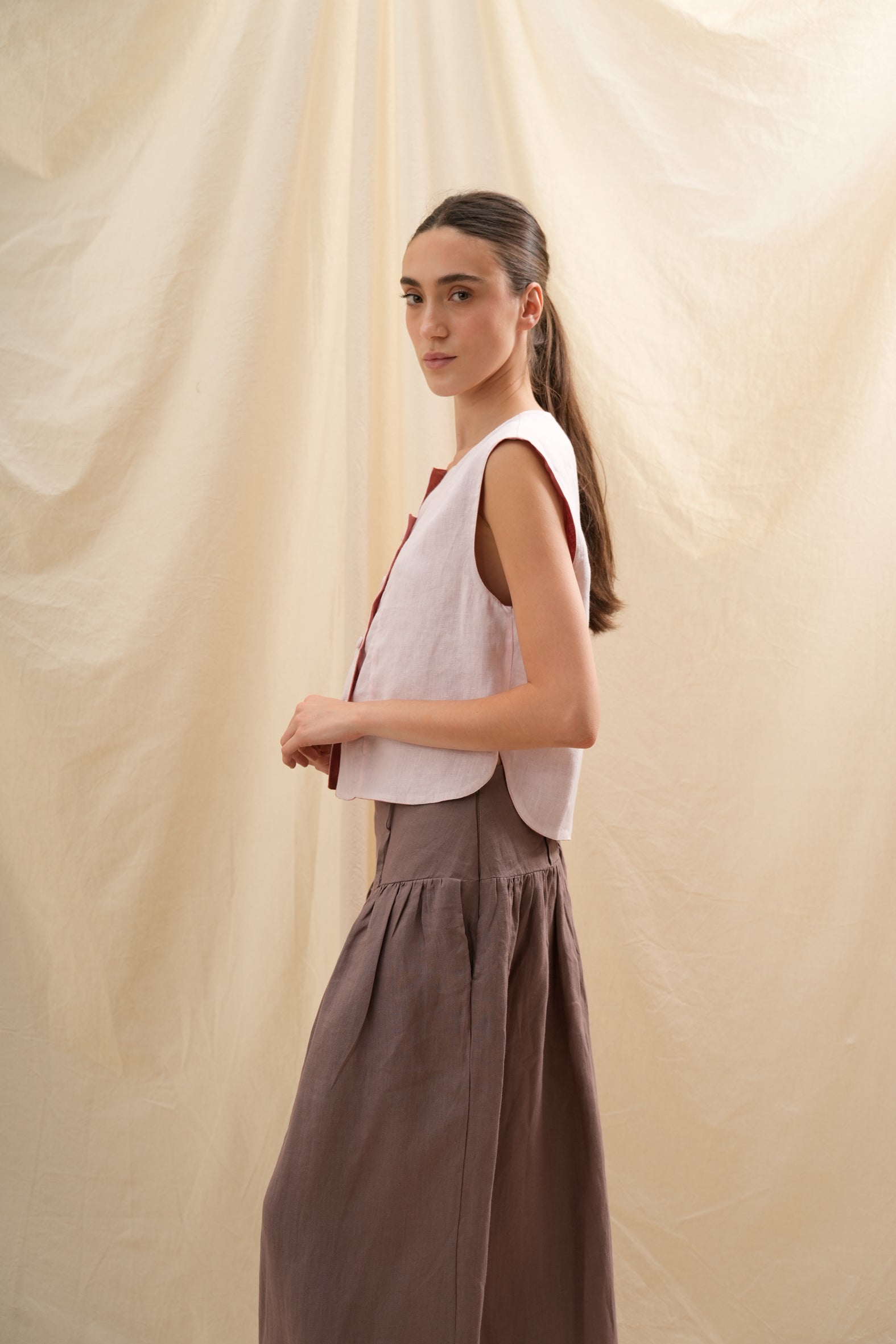 Confeccionado en lino europeo de alta calidad, redefine las superposiciones con una silueta liviana pero estructurada que aporta elegancia discreta a cualquier conjunto.