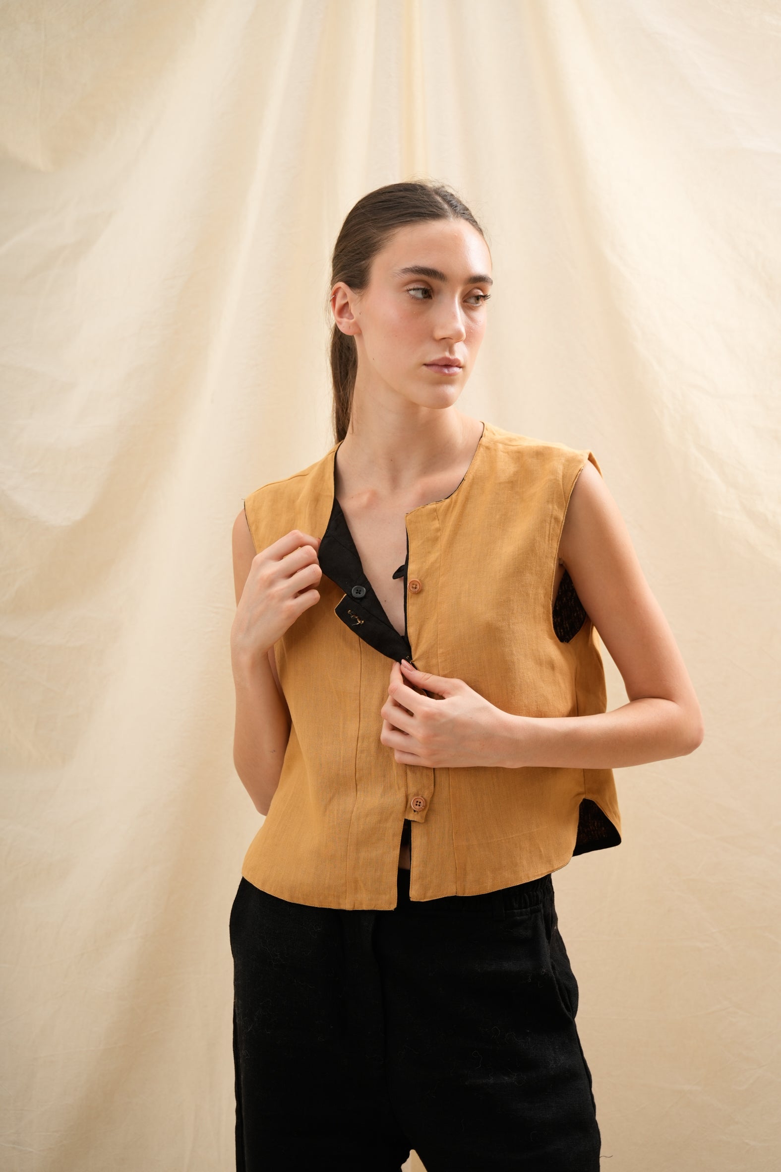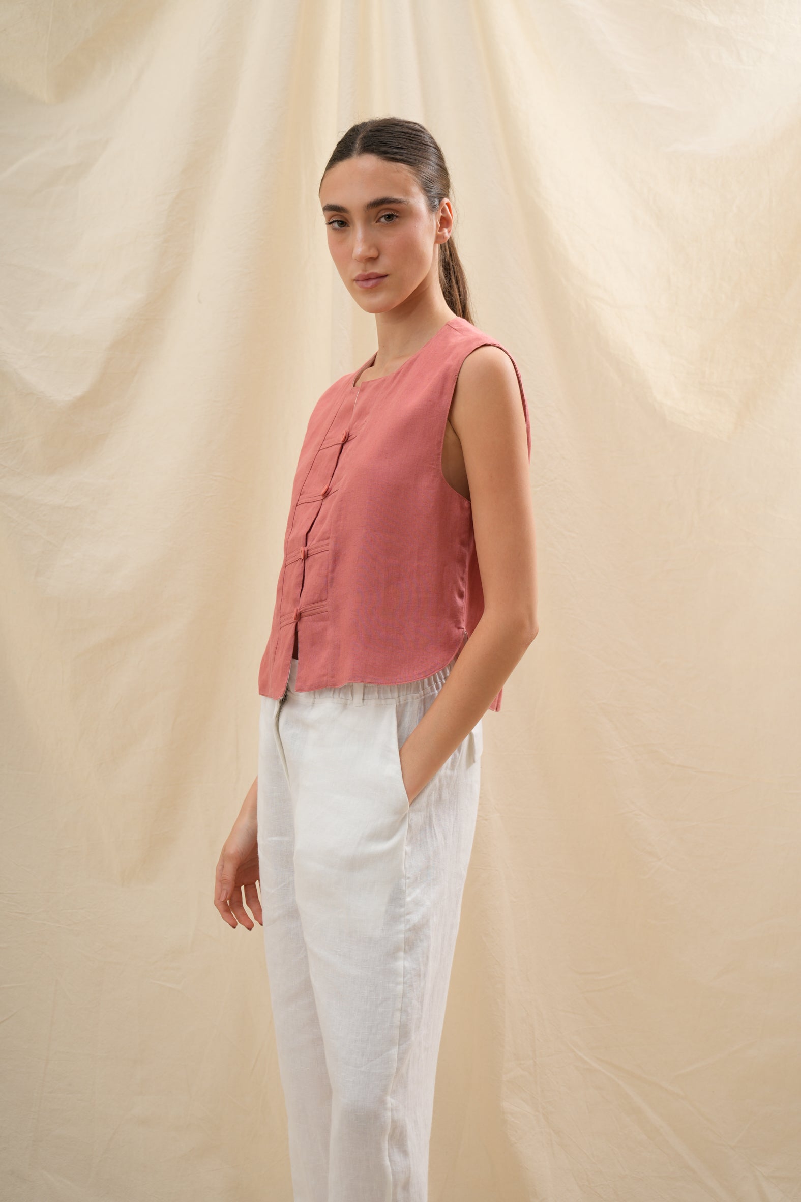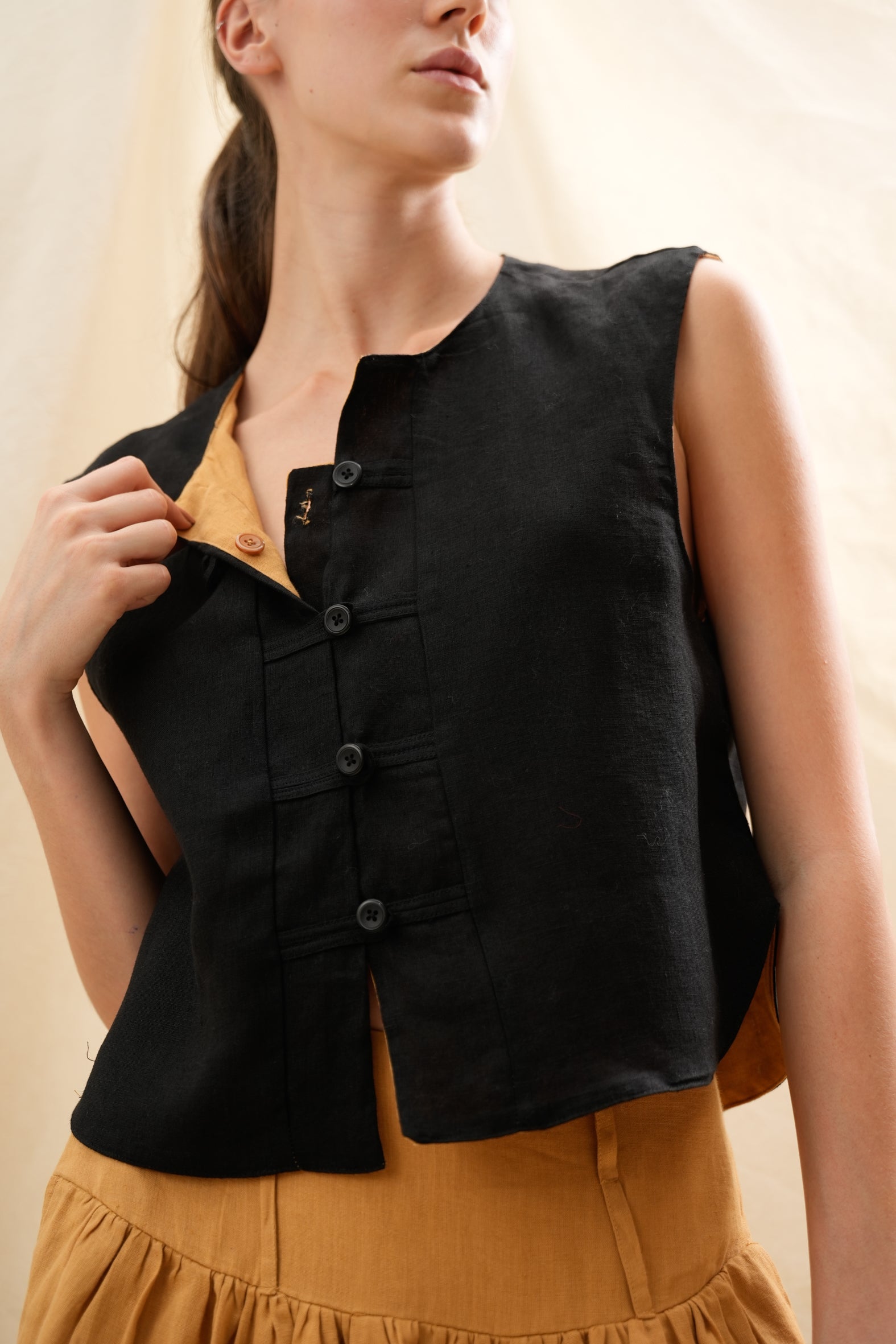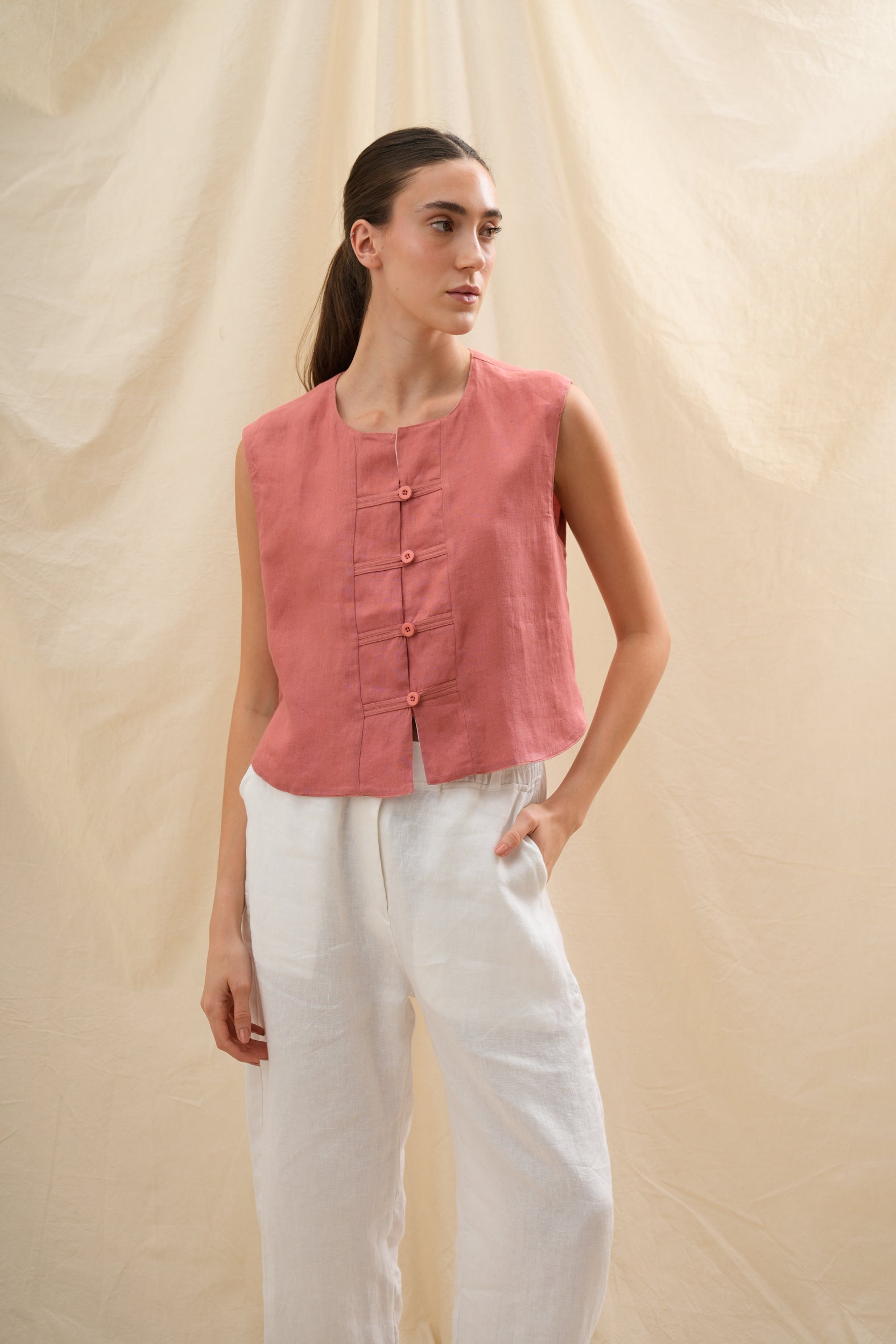 Confeccionado en lino europeo de alta calidad, redefine las superposiciones con una silueta liviana pero estructurada que aporta elegancia discreta a cualquier conjunto.