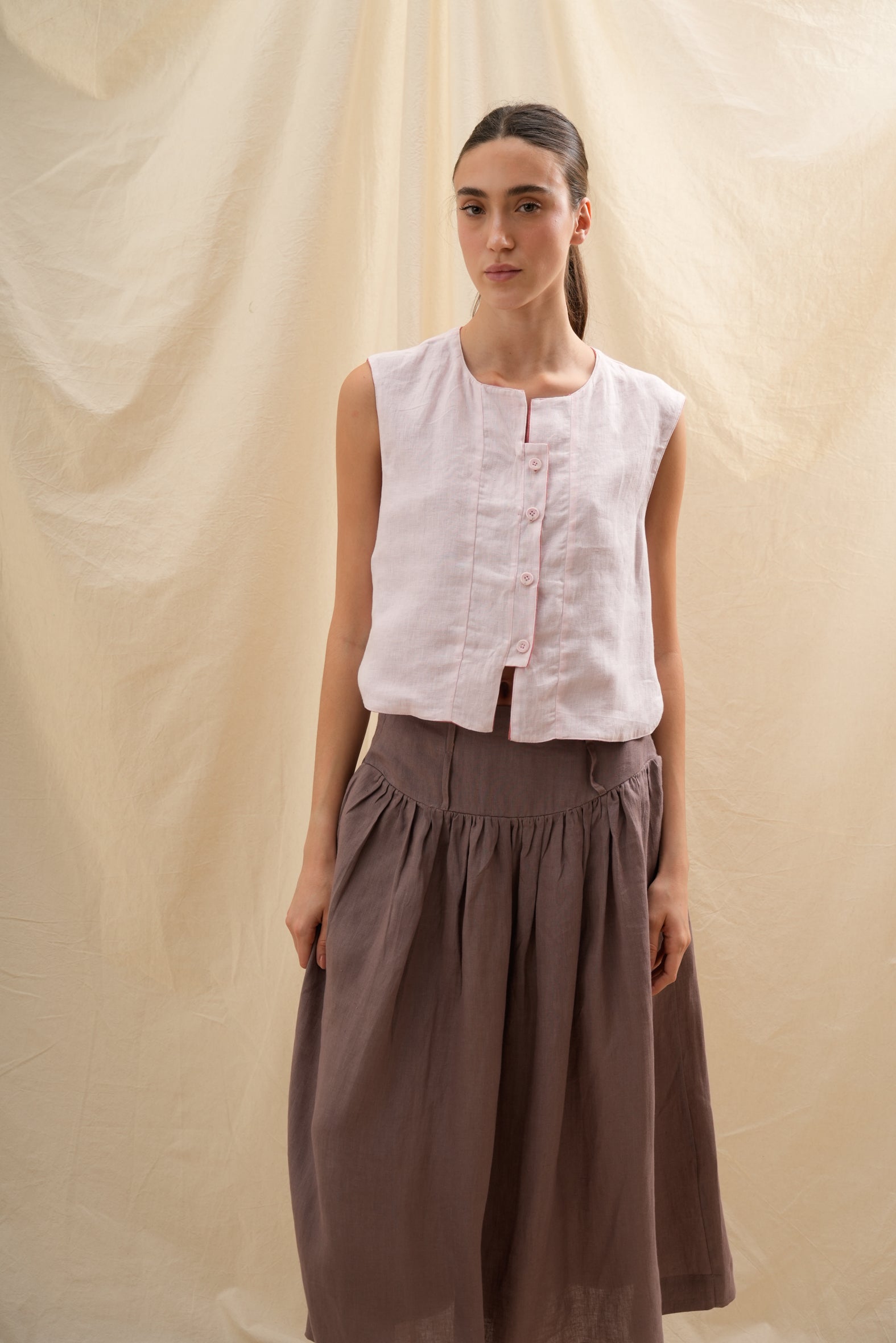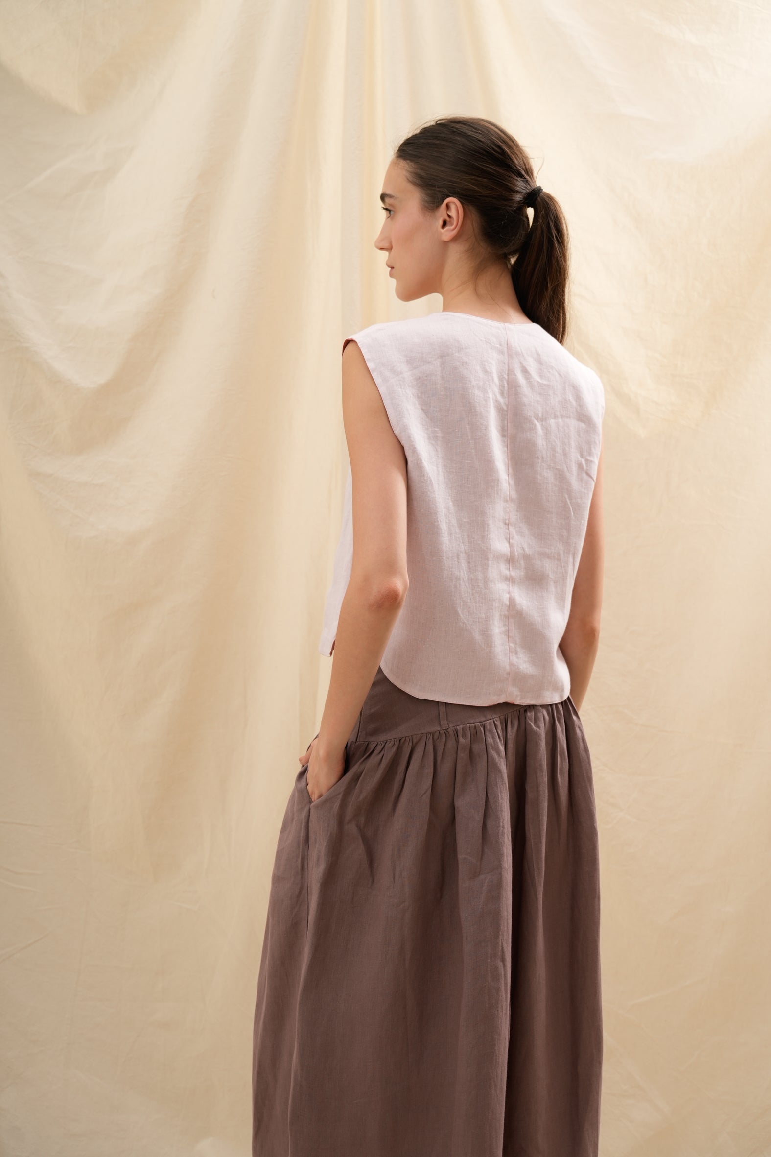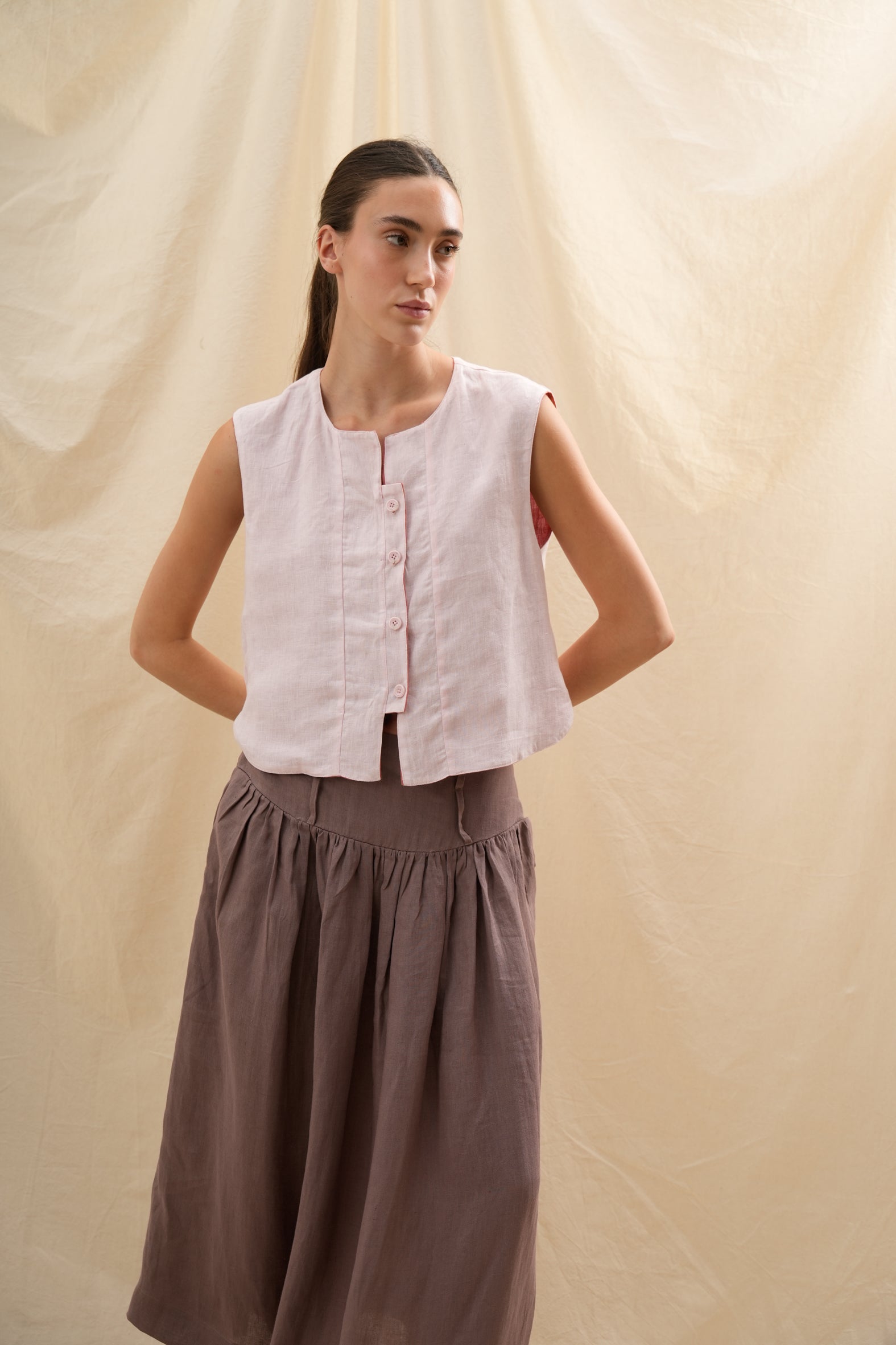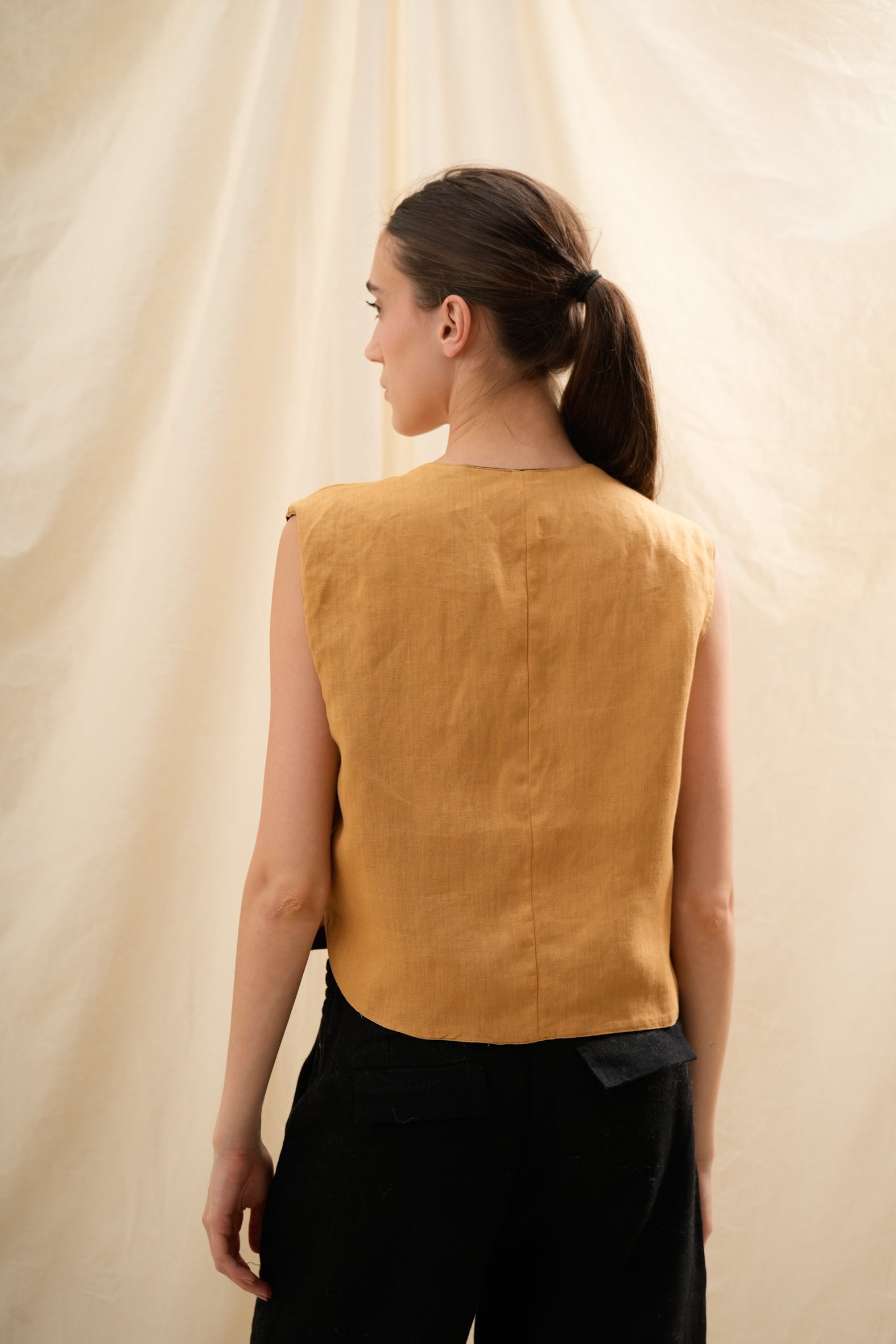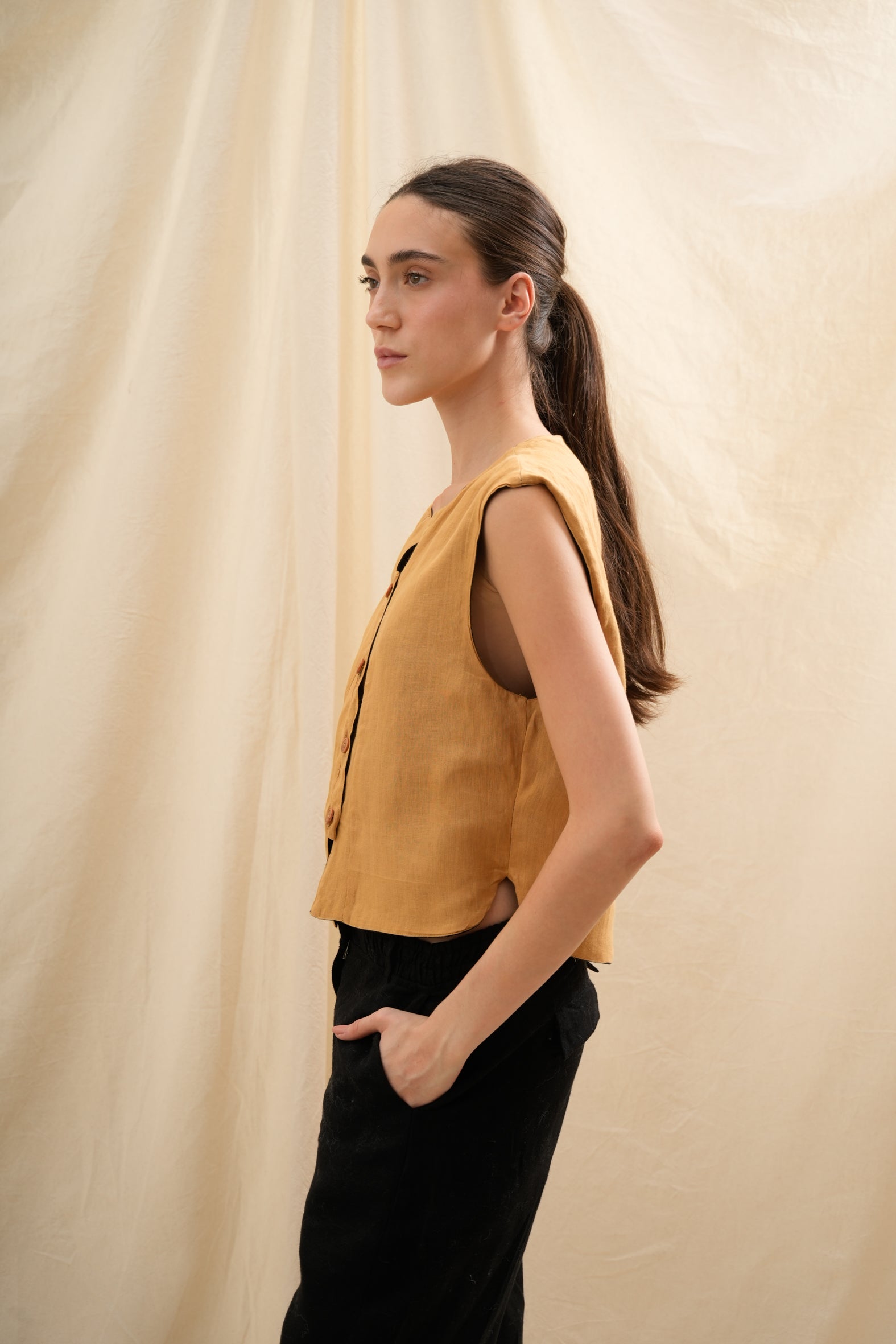 Confeccionado en lino europeo de alta calidad, redefine las superposiciones con una silueta liviana pero estructurada que aporta elegancia discreta a cualquier conjunto.