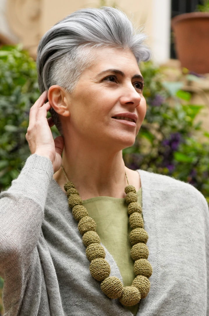 Este collar está hecho con chaguar, una fibra 100% vegetal proveniente del chaguar que es recolectado de manera natural por la comunidad Wichí y tejido a mano, utilizando técnicas tradicionales. Los tintes son totalmente naturales, extraídos de la flora local, lo que otorga a cada pieza un color único.