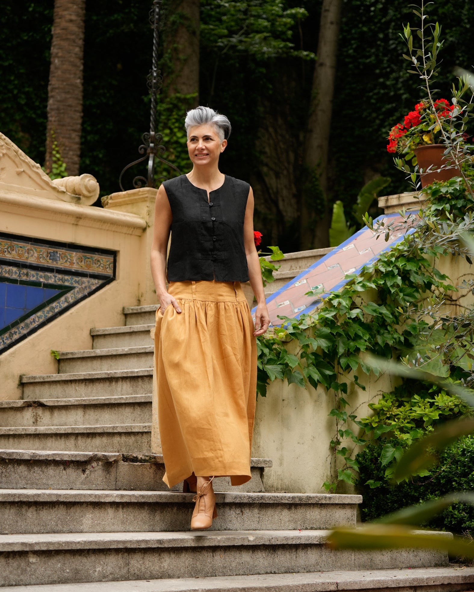 Elaborada en 100% lino natural, la Falda Dalia es transpirable, biodegradable y pensada para acompañarte por muchas temporadas — porque el verdadero lujo perdura.