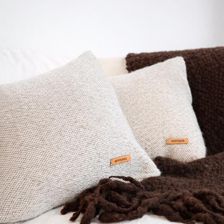 Funda confeccionada artesanalmente en telar manual con fibra 100% de baby llama, reconocida por su suavidad, resistencia y calidez natural. Su diseño incluye una solapa trasera para mayor practicidad y comodidad.