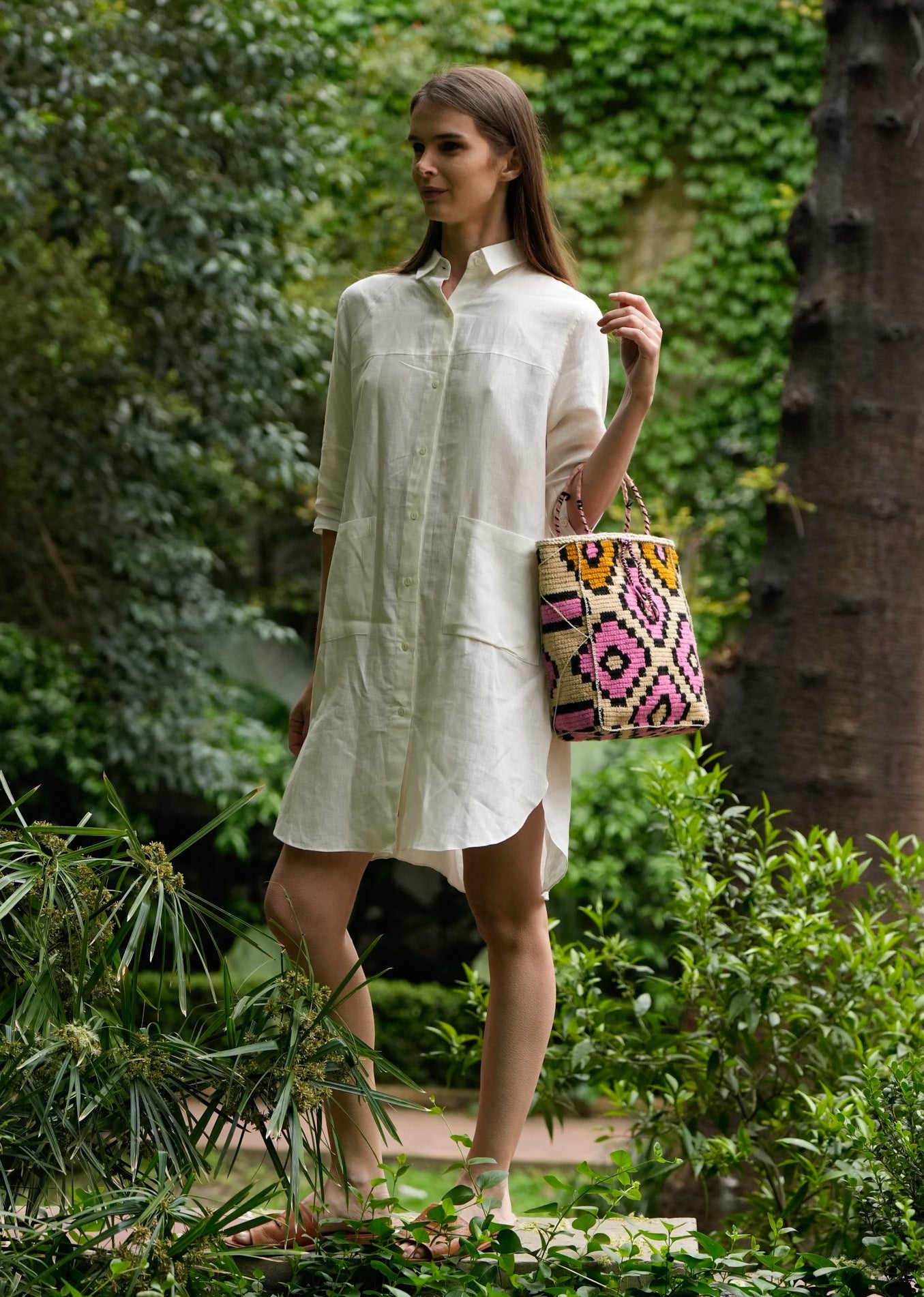 Vestido Clementina confeccionado en lino puro, una fibra natural que ofrece transpirabilidad excepcional y comodidad durante todo el día. Su diseño versátil combina elegancia con practicidad, permitiendo múltiples formas de uso según la ocasión. El lino proporciona una caída natural que favorece la silueta, mientras que su textura característica añade sofisticación. Ideal para climas cálidos, este vestido mantiene la frescura y se adapta perfectamente a tu estilo cotidiano o a eventos especiales.
